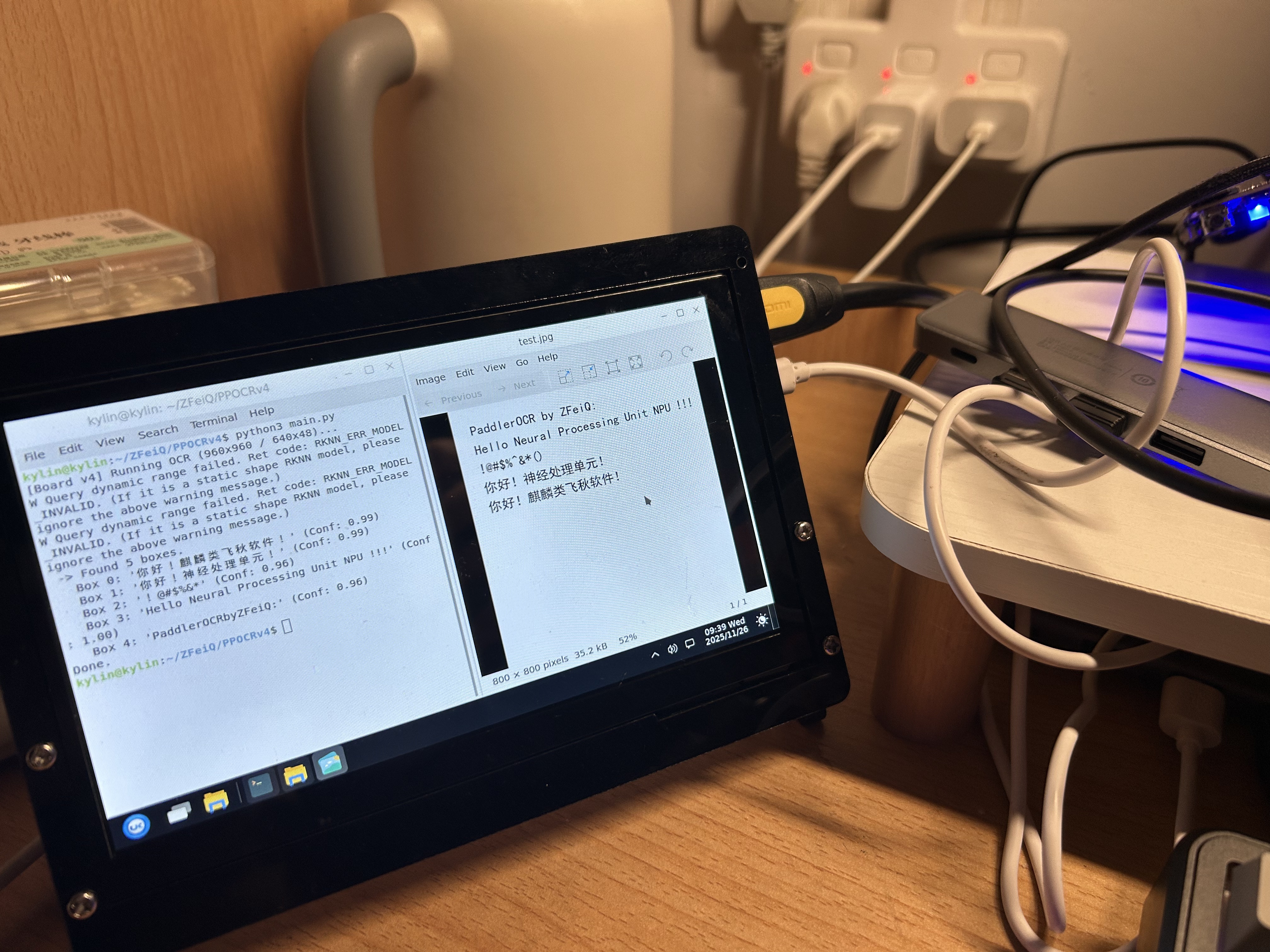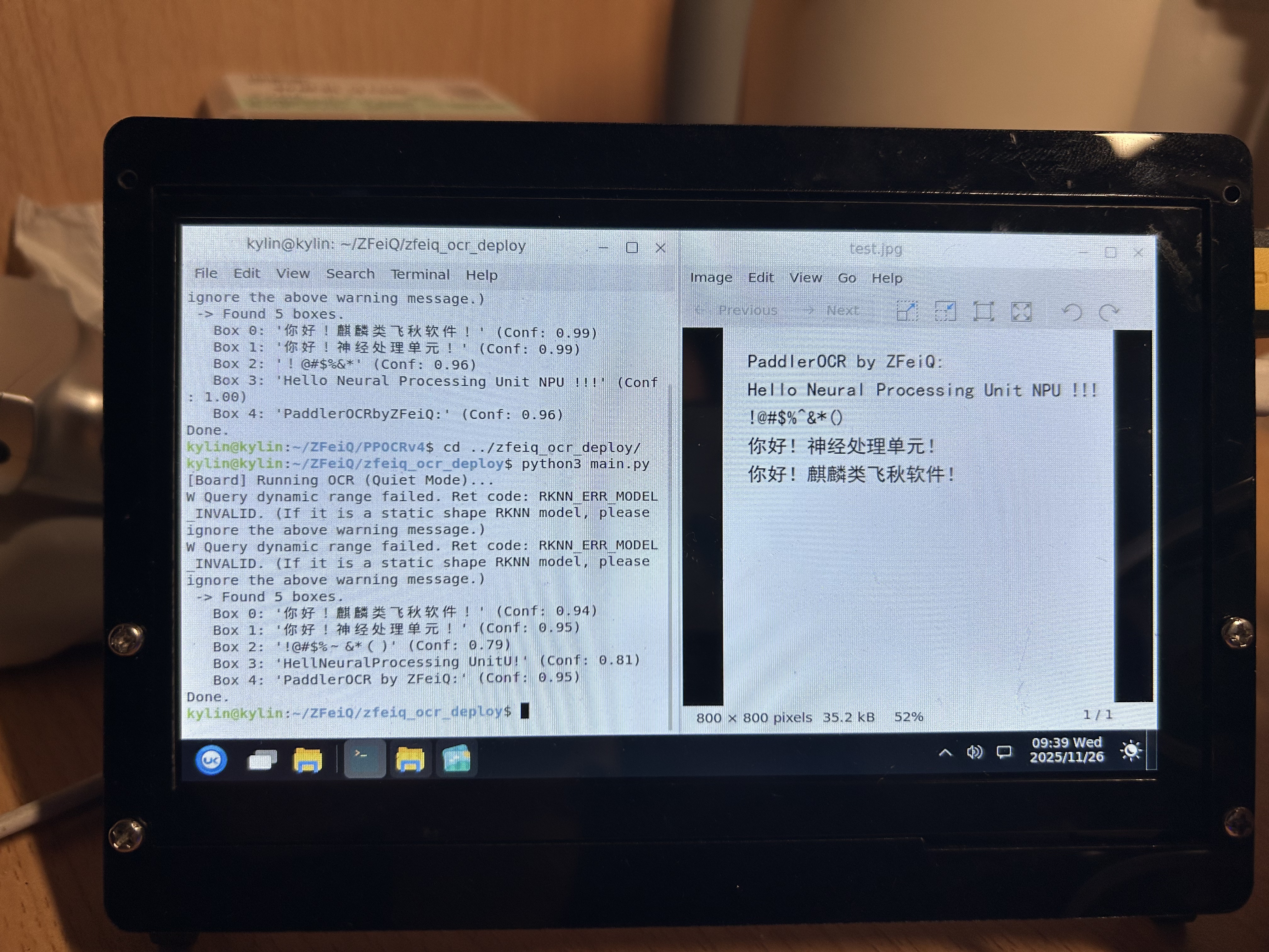 kylin@kylin:~/ZFeiQ/PPOCRv4$ python3 main.py [Board v4] Running OCR (960x960 / 640x48)... W Query dynamic range failed. Ret code: RKNN_ERR_MODEL_INVALID. (If it is a static shape RKNN model, please ignore the above warning message.) W Query dynamic range failed. Ret code: RKNN_ERR_MODEL_INVALID. (If it is a static shape RKNN model, please ignore the above warning message.) -> Found 5 boxes. Box 0: '你好!麒麟类飞秋软件!' (Conf: 0.99) Box 1: '你好!神经处理单元!' (Conf: 0.99) Box 2: '!@#$%&*' (Conf: 0.96) Box 3: 'Hello Neural Processing Unit NPU !!!' (Conf: 1.00) Box 4: 'PaddlerOCRbyZFeiQ:' (Conf: 0.96) Done.