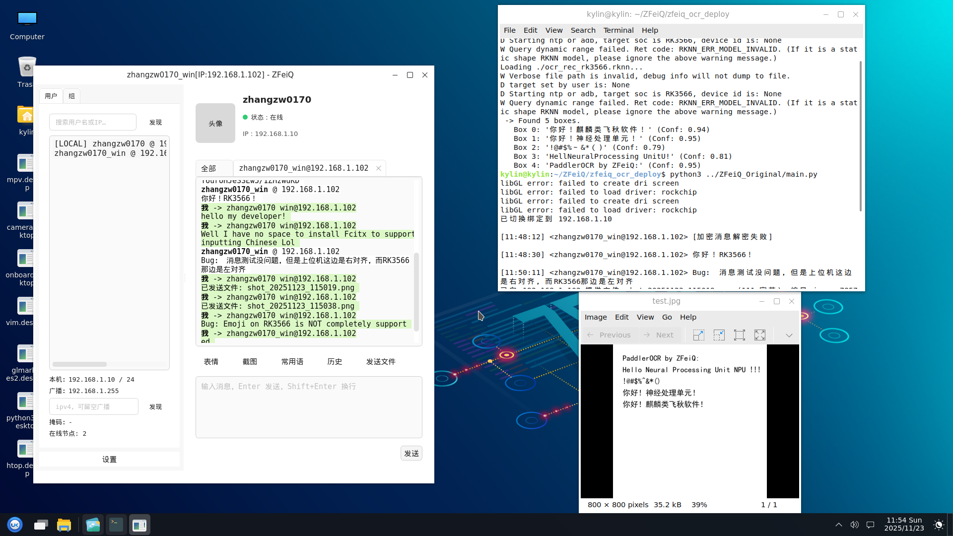 最终成果:ZFeiQ 聊天软件现在具备了完全离线、毫秒级响应、高达 99% 准确率的中文 OCR 能力。这证明了只要优化得当,低算力国产芯片也能承载现代化的 AI 应用。